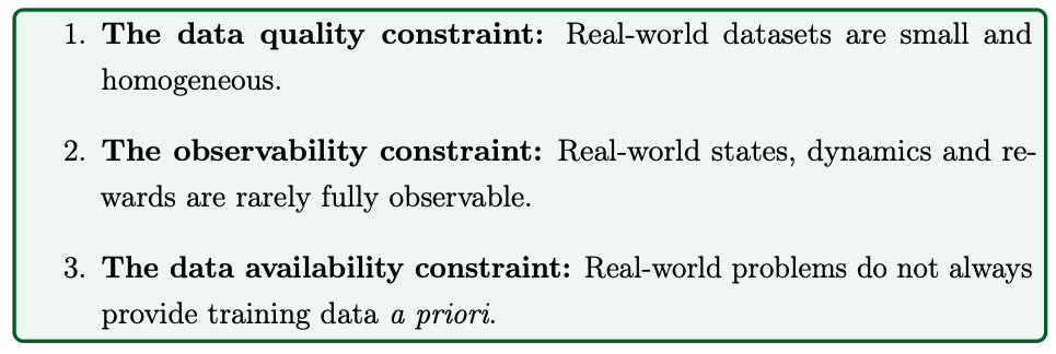 - Data demonstrating the optimal policy is rarely available (so we can't imitate the optimal policy with supervised learning)